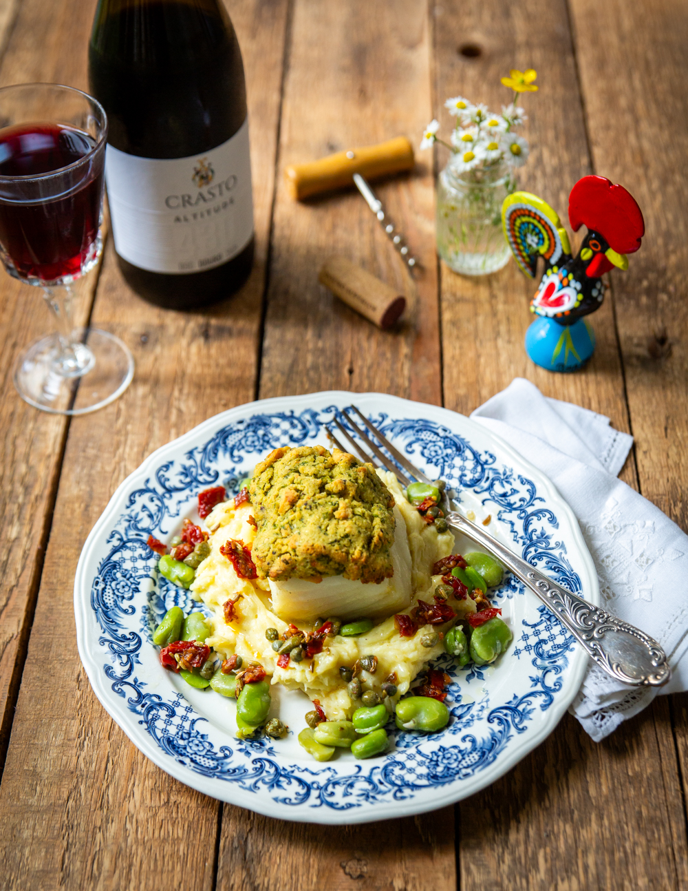 This recipe is inspired by my travels for Bom Dia Anne through Portugal and a visit to Bexeb, a Portuguese épicerie in Käerjeng that’s packed with the best flavours of Portugal. Here I found my favourite bacalhau fillets – perfectly cut, already desalted and ready to cook – along with rustic broa cornbread, frozen Portuguese broad beans, and a beautiful bottle of Crasto Altitude from the Douro.