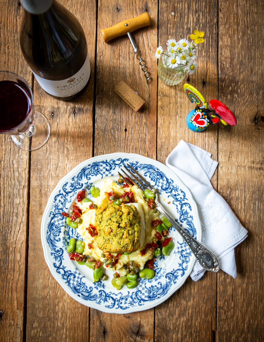 At home, the magic happens: golden-crusted bacalhau, creamy potato mash, tender broad beans and a vibrant salsa of sundried tomatoes, crispy garlic, fennel seeds, capers and lemon zest. It’s a little taste of Portugal, with my own signature twist – perfect with a chilled glass of Douro wine.