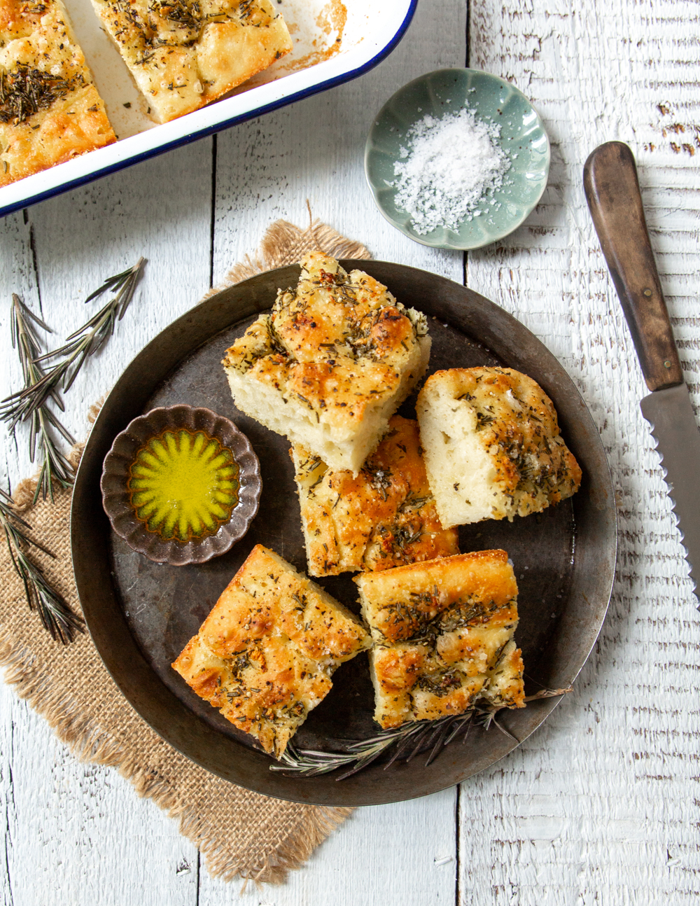 This is the easiest focaccia you’ll ever make! It doesn’t require any kneading, but instead, you will need to bring a little bit of patience. Once all the ingredients are stirred together with a spatula, the dough goes in the fridge for 12 hours – so best is to prepare the dough the night before you want to bake this beauty. And what a beauty it is! Brace yourself for the most moist focaccia ever!