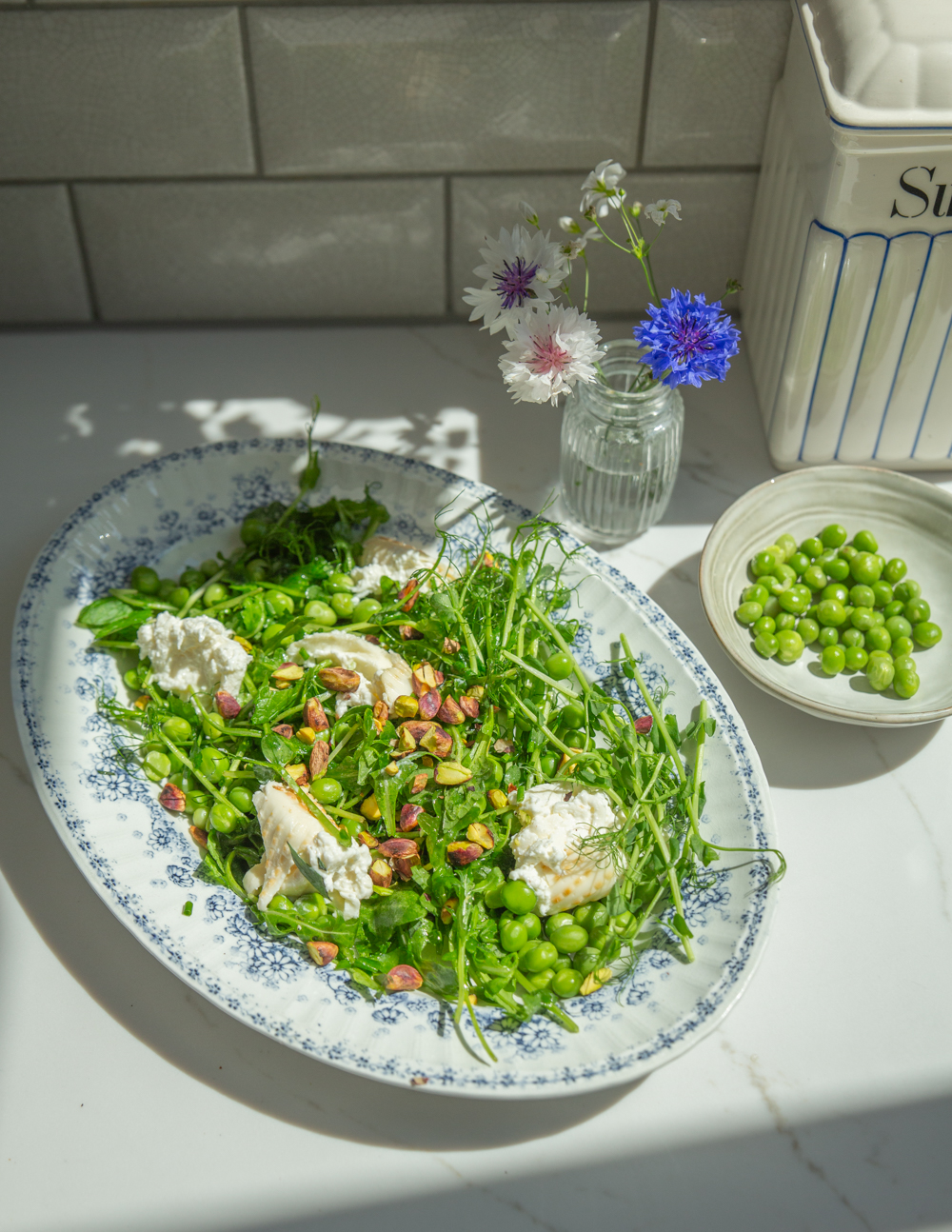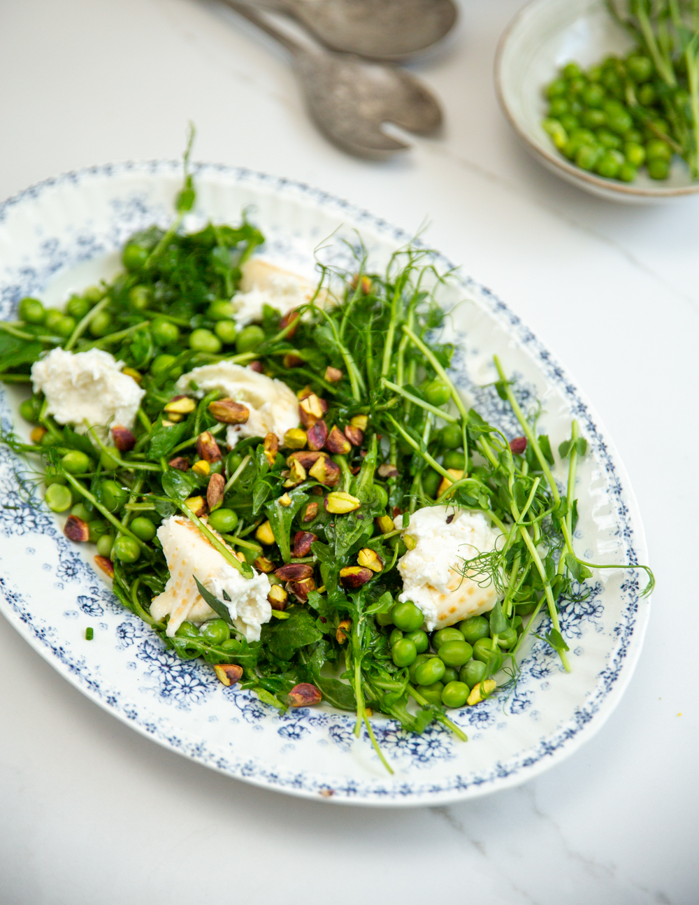 This salad is one of my go-to summer salads, it’s just so fresh and creamy and makes the best of summer flavours. Fresh peas are combined with pea shoots, ruccola and toasted pistachios, and given the creamy treatment by some smoked burrata. So quick and easy to assemble and just incredibly yum!