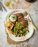 Finish the salad: squeeze the courgette slices to get rid of any excessive liquid, and put into a serving bowl with the broad beans. In a small bowl, mix the mustard, honey, olive oil and lemon juice and pour over the courgettes. Stir through the capers, mint and basil and season with salt and pepper.