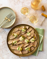 Start with the courgette salad. Using a mandolin, slice the courgettes into very thin slices. Put in a colander and mix with ¼ tsp salt, massaging the salt into the slices. Set aside for 15 minutes to soften.