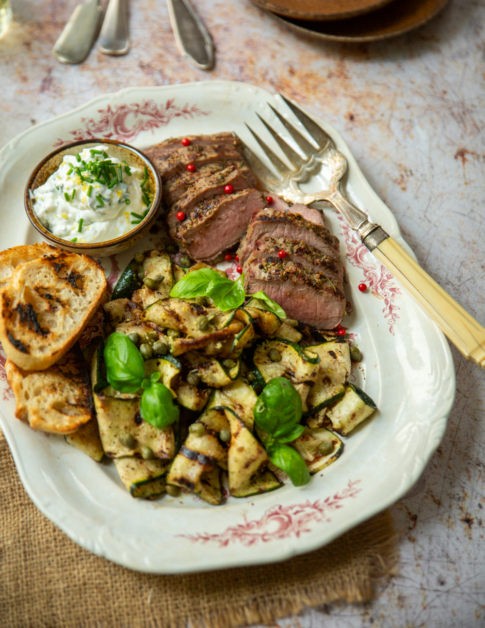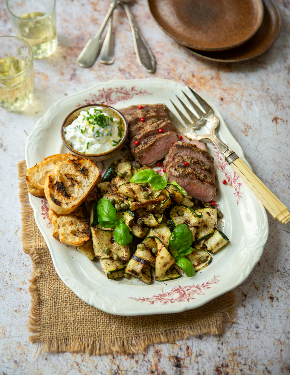 Pepper-crusted wild boar with grilled courgettes