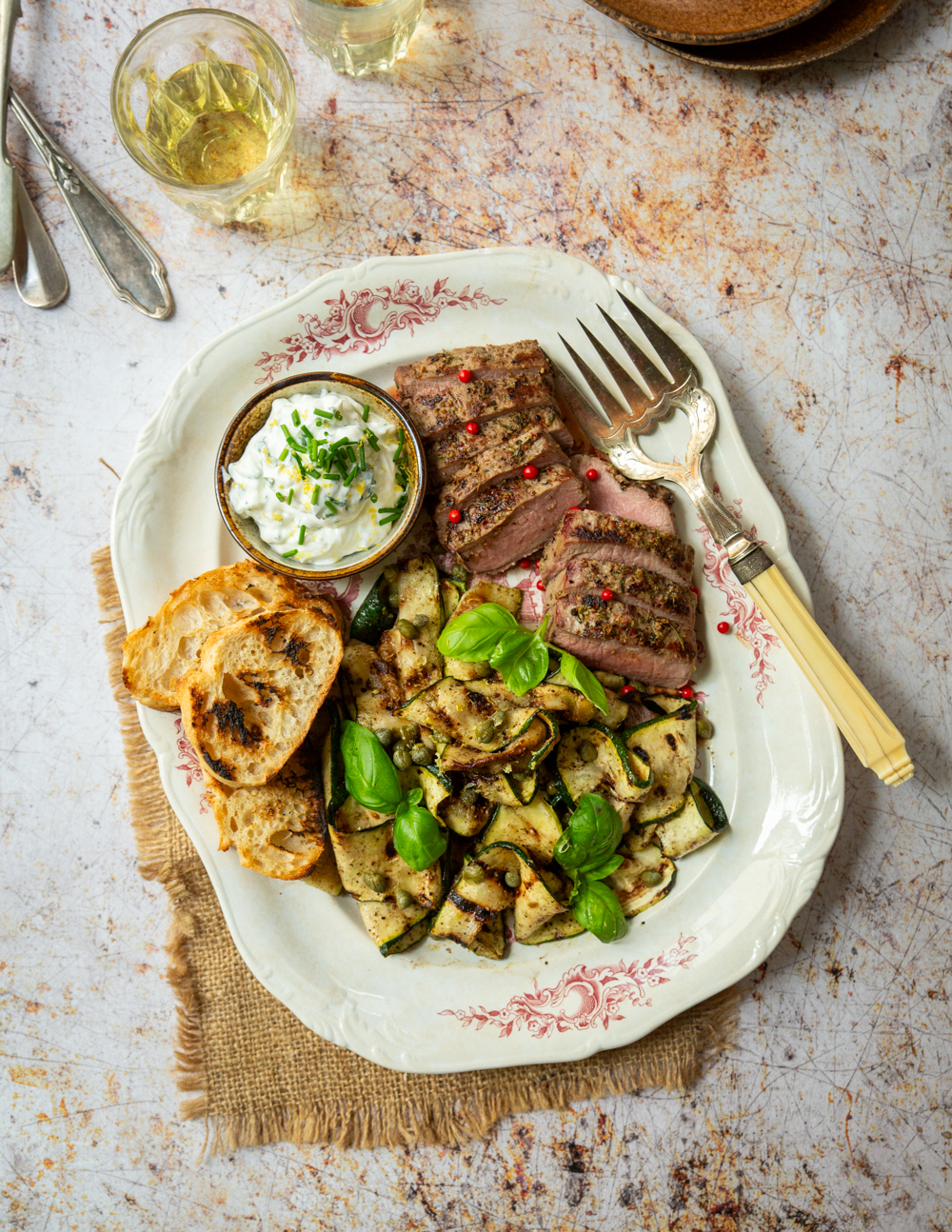 Pepper-crusted wild boar, smoky courgette ribbons, and a cooling lemony yoghurt dip – the perfect summer plate. And the best part? Wild boar is one of the most sustainable meats you can cook with: no feed, no transport, no industrial farming. Just wild game from our region.